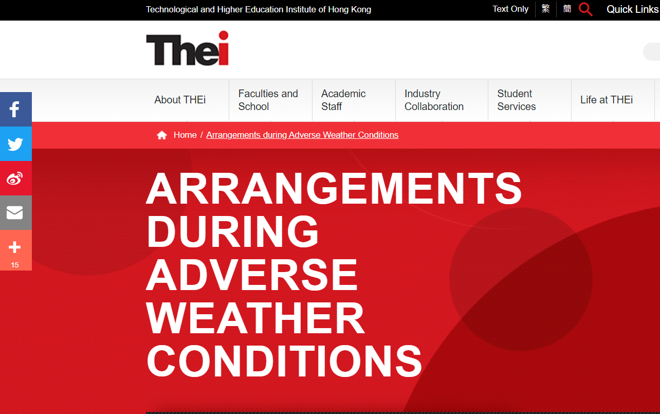 For your general information on the “Class/Exam arrangements during Adverse Weather Conditions”, please refer to your Student Handbook or THEi website (https://www.thei.edu.hk/arrangements-during-adverse-weather-conditions) for details.