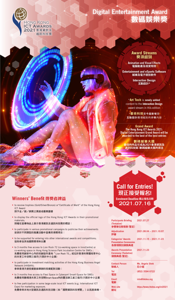 Steered by the Office of the Government Chief Information Officer (OGCIO) and organized by Hong Kong Information Technology Federation (HKITF), the Hong Kong ICT Awards 2021: Digital Entertainment Award seeks to recognise and honour the best works produced by the Hong Kong Digital Entertainment Industry and to promote excellence in this field.